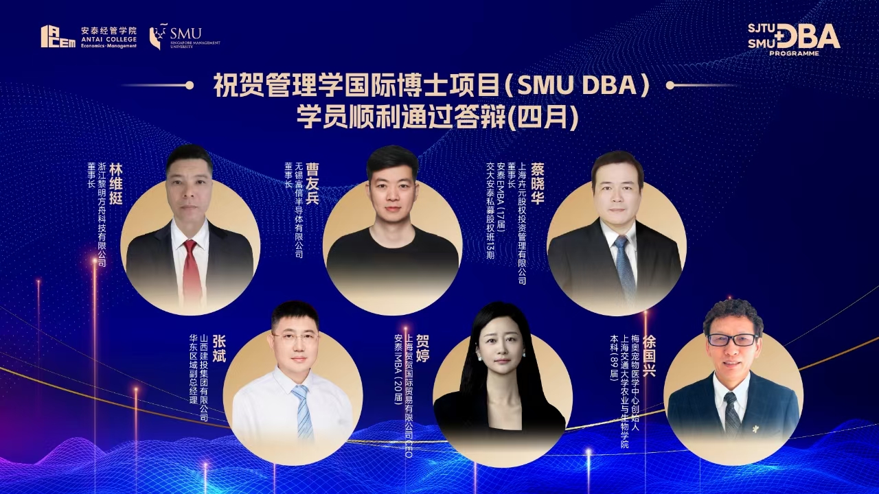 上海交通大学管理学国际博士项目(DBA)是安泰经济与管理学院与国际知名商学院联合举办的高等学位教育项目,结合中西方顶尖学术力量,立足中国、放眼全球、旨在培养集应用、管理、研究大成于一体的企业家和管理者。目前已与新加坡管理大学李光前商学院、法国南特高等商学院从不同研究方向联合培养企业家学者。通过系统化的学习研究理论与方法,促进商业实践与学术的结合。学员从不同的视角来探索全球商业社会,在系统学习和论文答辩后,获得国际商学院工商管理博士学位。
