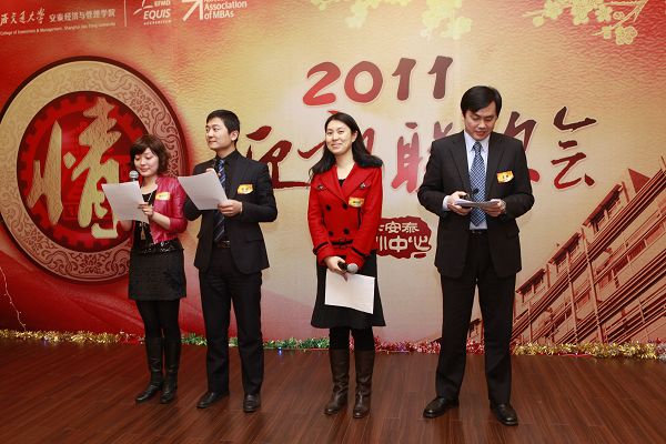 联谊会由两个班的四位学员主持,交大安泰经济与管理学院院长助理赵心耘老师致开场词。赵老师首先感谢同学们的积极参与和热心奉献,非常高兴各班同学能够齐聚一堂。希望同学们即使以后课程结束也能常回“家”看看,并寄语同学们在2011年宏图大展。