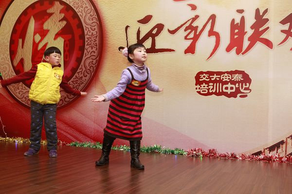 之后同学们表演的节目丰富多彩,令人耳目一新。有令人捧腹大笑的舞蹈《嘻唰唰》、自编自演的小品《武林外传》。学员和老师也带来了小朋友们给大家表演,有双人舞《猫王》和古筝演奏,让大家感受到了小朋友们的天真和才艺。除了预定的节目,顶级品牌班的东方电视台著名主持人龚露为大家带来歌曲《甜蜜蜜》,10春1班来自上海戏剧学院的孙鱼洋也朗诵一首《我骄傲,我是中国人》,全场掌声雷动。最后,办公室全体老师带来的手语舞蹈《相亲相爱一家人》掀起了晚会的高潮。