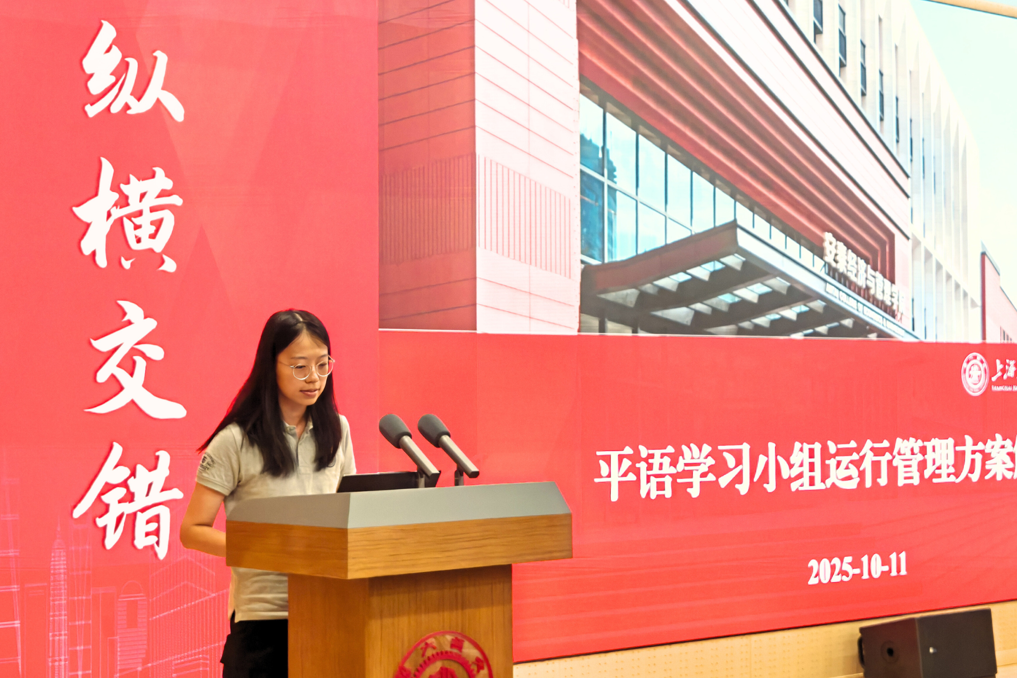 平语学习小组2025-2026学年学生总负责人、2024级本科生陈芊妤作为新任负责人代表发言。她向上一届负责人的辛勤付出致以诚挚感谢,并阐述了平语学习小组的核心工作理念。面对未来工作,她表示将从活动内容和组织管理两方面着力,与同学们一起把平语学习小组建设成更有温度、有深度、有影响力的成长平台。最后,她以“心有所信,方能行远”与大家共勉,共同向党组织靠拢。