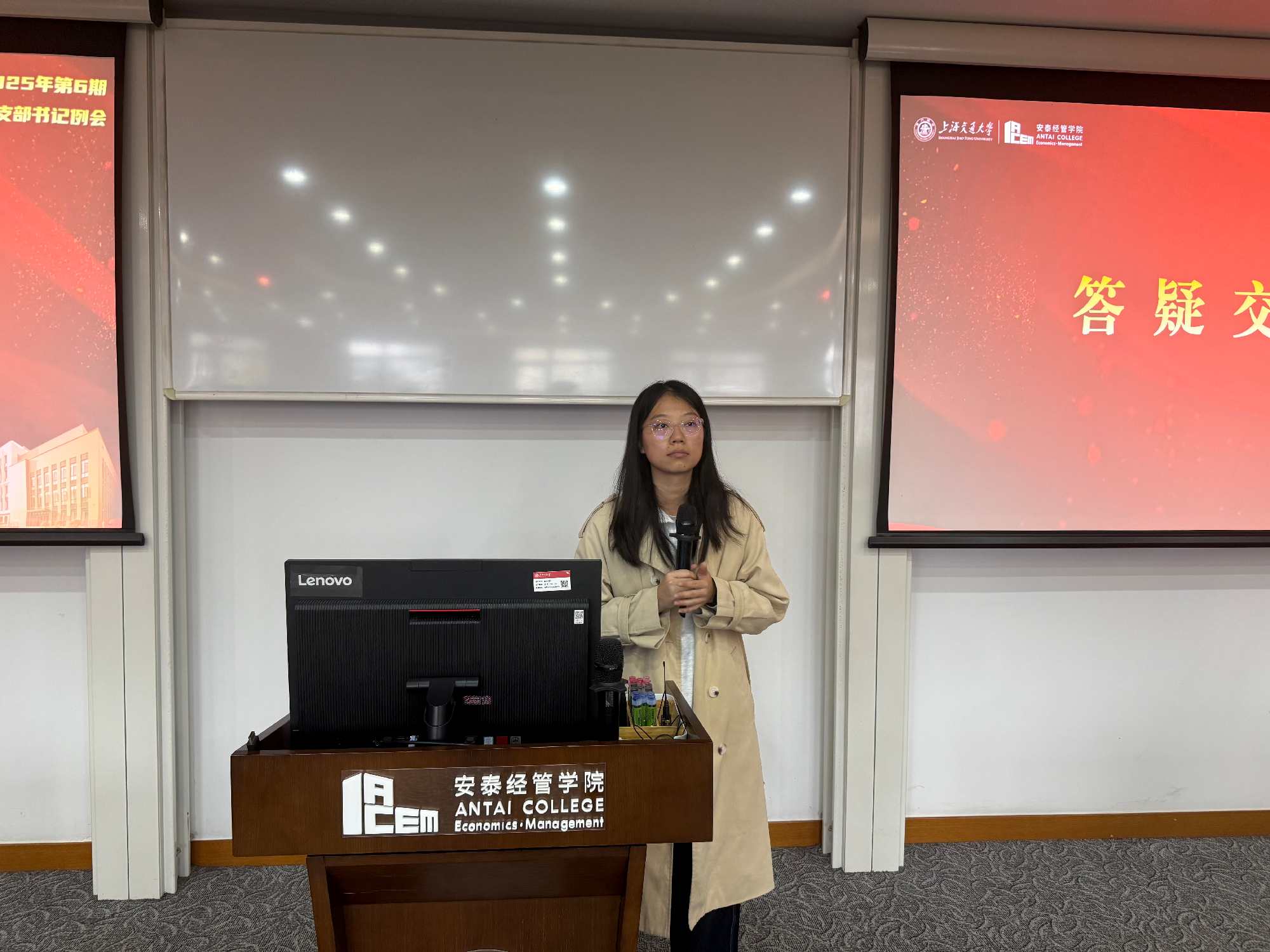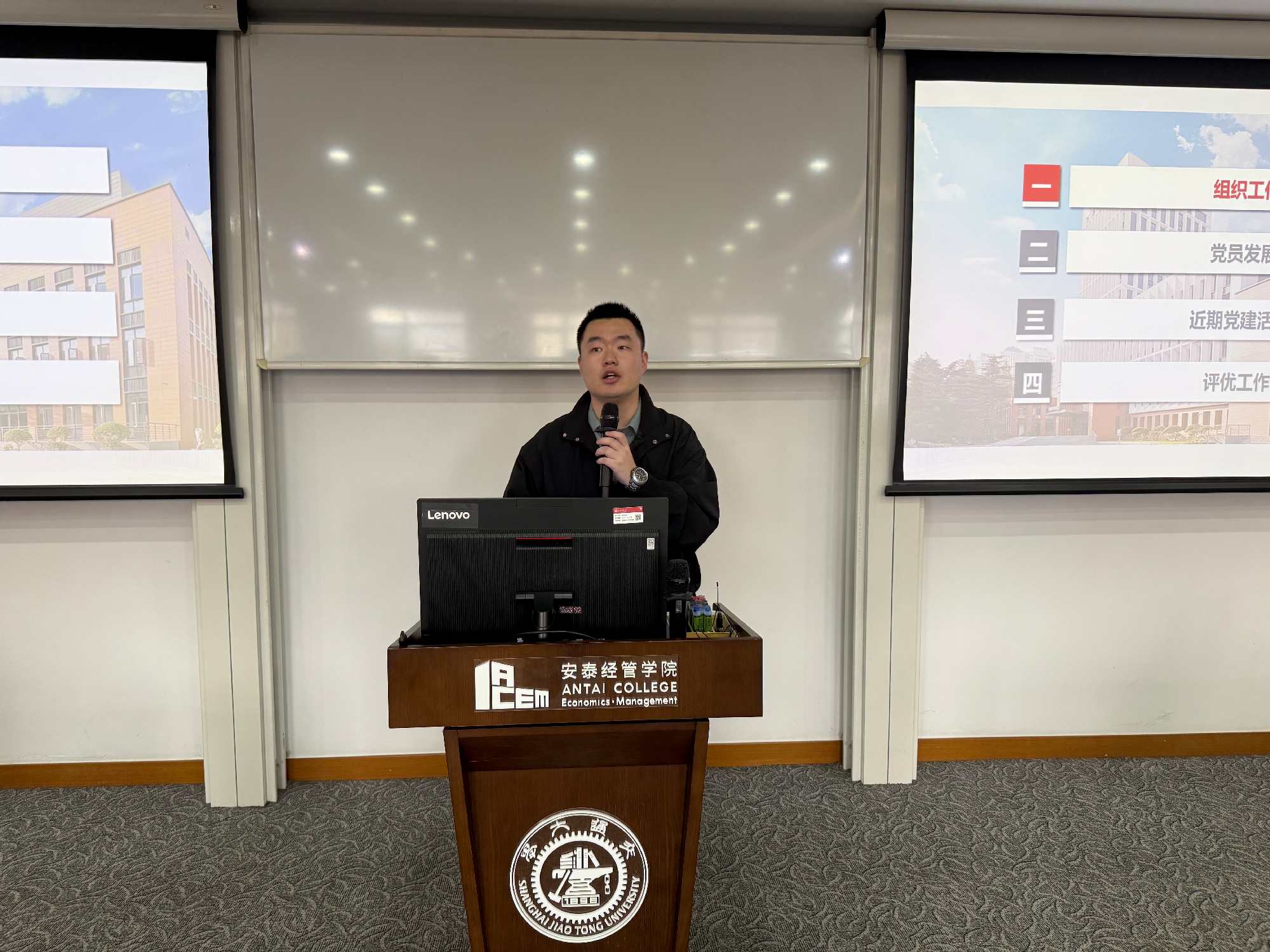 张晋豪作近期党建工作安排部署,内容涵盖组织工作、党员发展、党建活动及评奖评优等。组织工作方面,他向各学生党支书讲解了新生党员组织关系接收及党费缴纳的有关操作;党员发展方面,他对学院2025年下半年发展对象选拔工作进行了总结;党建活动方面,他回顾了学院近期组织开展的重要活动,介绍了学院即将准备开展的几项活动及主题党日学习要求;评奖评优方面,他简要介绍了优秀主题党日案例、党支部书记微党课大赛等项目,鼓励大家积极报名,展现安泰学生党建风采。