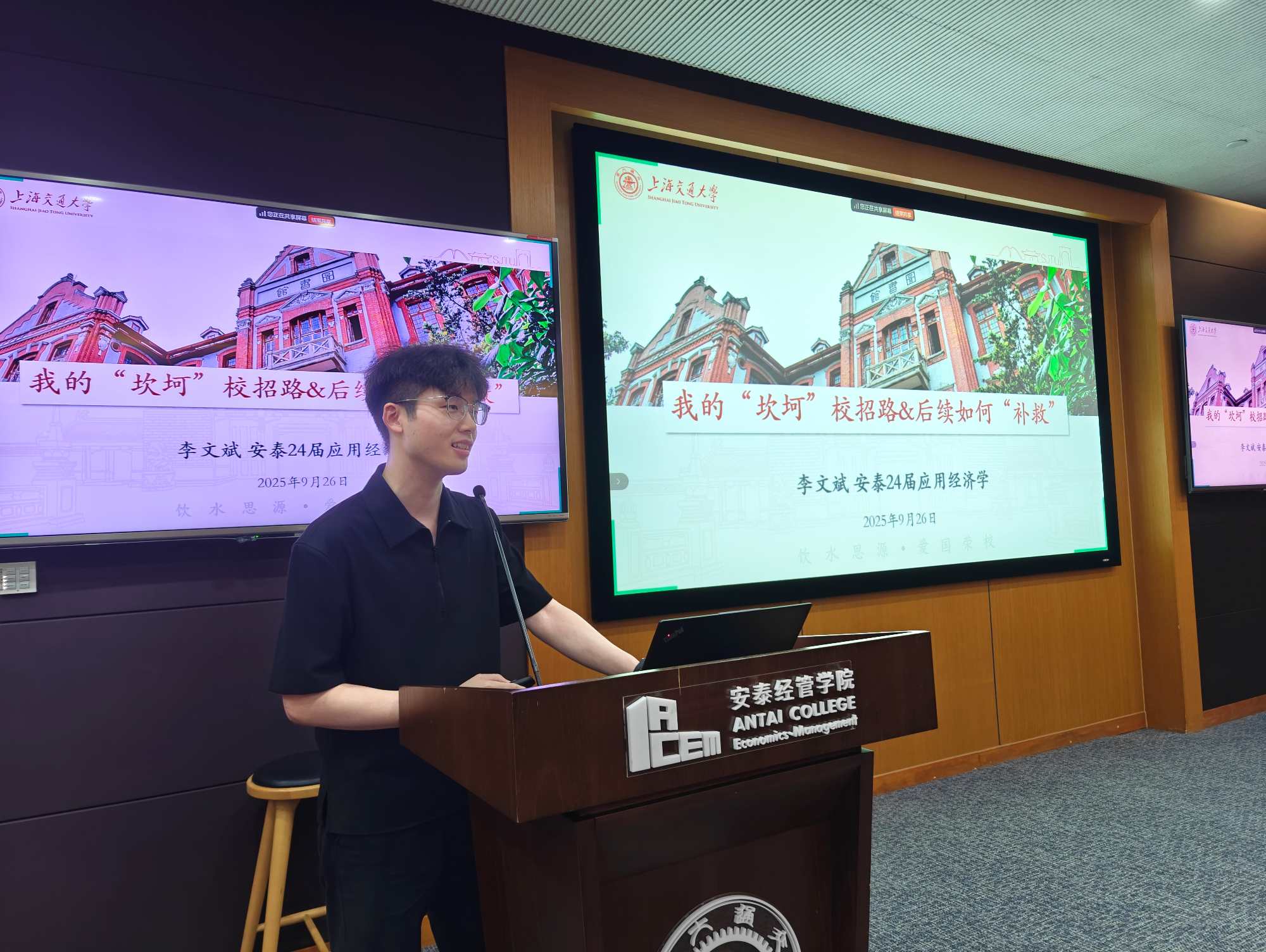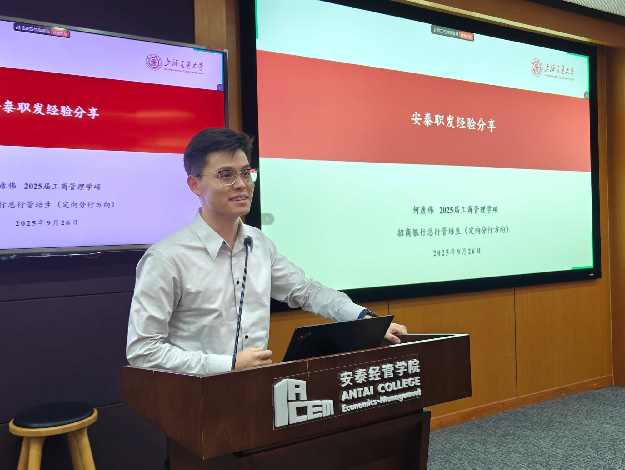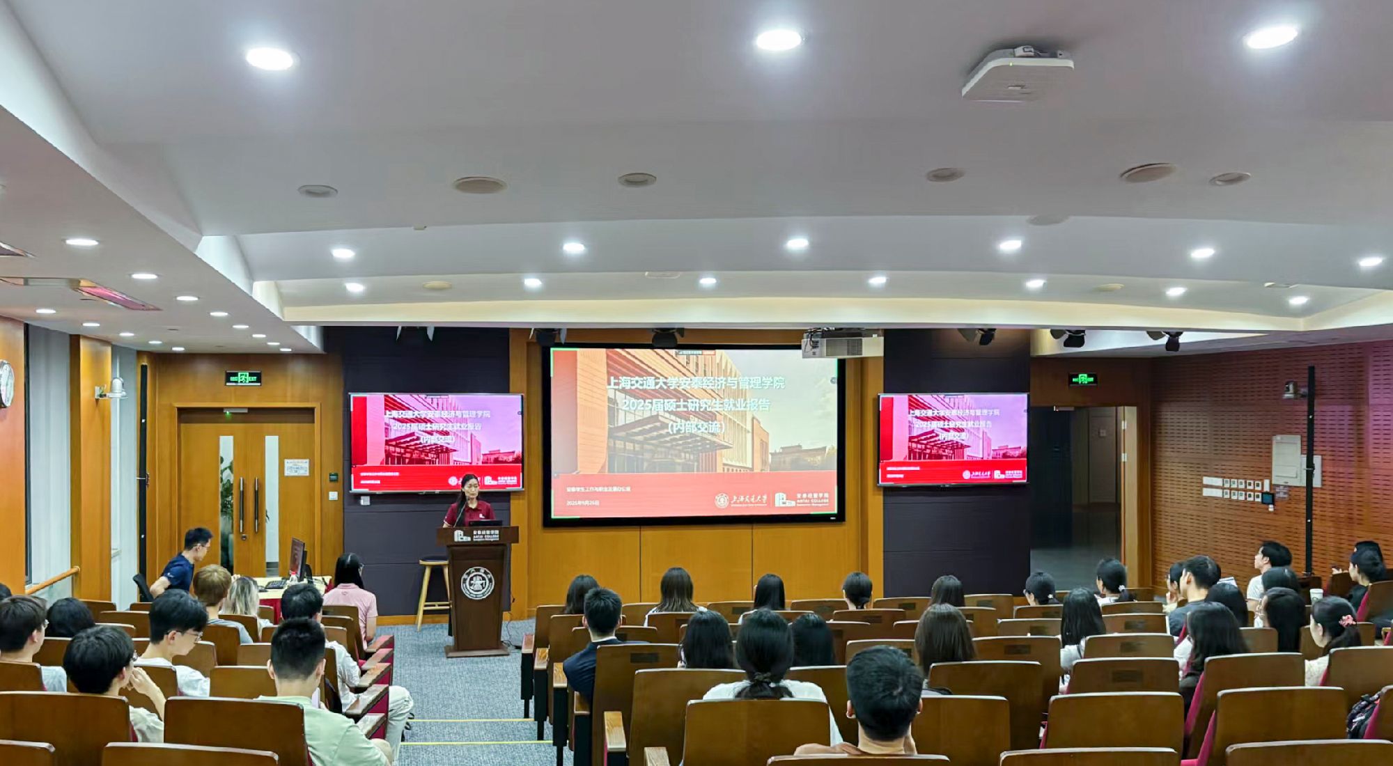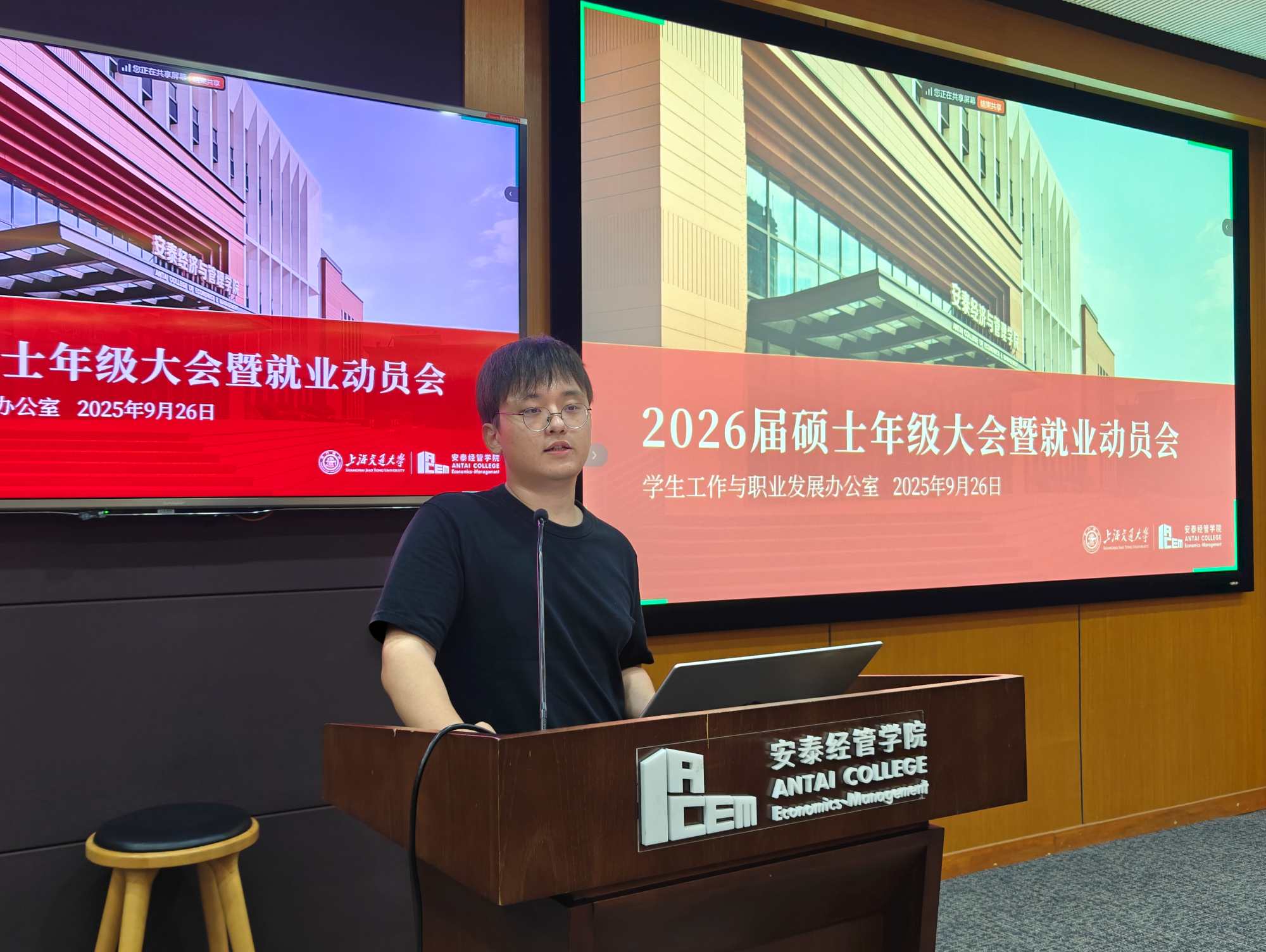 2025年9月26日晚,上海交通大学安泰经济与管理学院2026届硕士研究生年级大会暨就业引导大会顺利举行。本次会议为年度安泰职引系列活动第11期,针对全体2026届硕士研究生,年级思政老师与硕士职发老师出席,4位优秀校友代表特邀参加。会议紧密围绕 2026 届研究生毕业季所面临的热点需求展开,结合最新就业数据,解读当前就业市场特点,通过校友切身经验引领和职发中心资源护航,为同学们秋招实战提供有效指引与坚实保障。