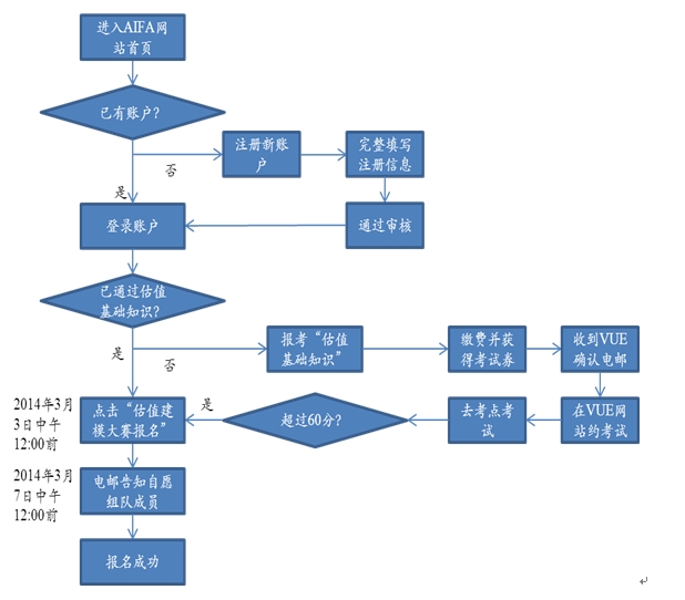报名网址:请在AIFA实用投融资分析师网站(http://www.aifaedu.com/loginUI)注册账号并提交个人信息,通过审核后即可在系统中进行报名操作。 - 时间要求:2014年3月3日中午12:00前获得考试成绩并填写第二阶段自愿组队的成员姓名及AIFA ID。