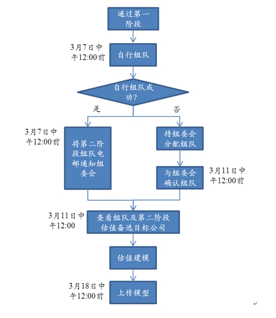 第一阶段采取个人机考的方式,60分(含)以上者方可取得第二阶段参赛资格;第二阶段采取团体赛的方式,三人组队,要求其中至少有一人参加过较为专业的估值建模培训。(注:本赛会认可的专业建模培训包括诚迅金融培训公司、AMT Training、TTS提供的估值建模培训。)