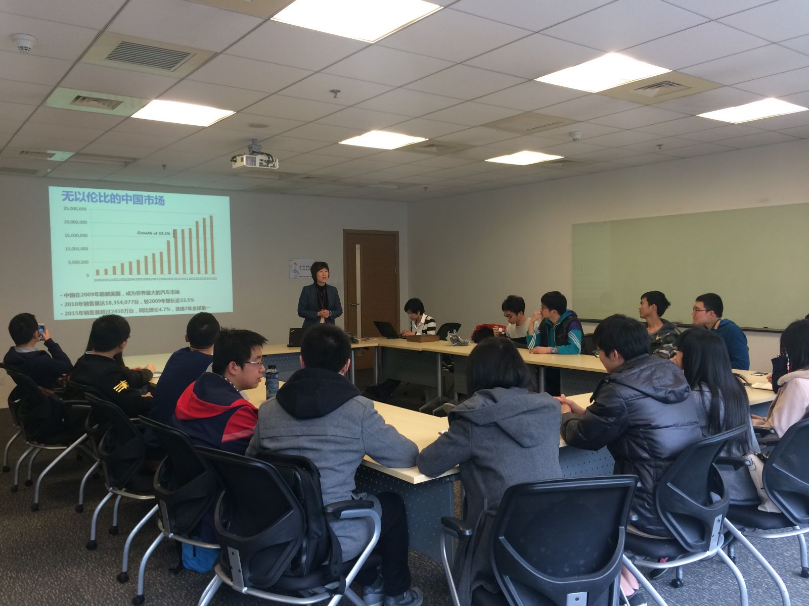 到达上汽通用企业的园区之后,总经理办公室周燕副主任带领同学们进入会议室,并就公司概况、组织发展战略进行了介绍,让大家对公司及汽车行业有了更加全面的认识。接下来,HR校园招聘负责人苏捷对公司内部的薪酬福利体系及相关活动进行了简要介绍,并重点介绍了2016年校园招聘与暑期实习项目的相关内容,包括时间计划,招聘流程,培养方案等。整个过程气氛活跃,同学们积极回答周主任和苏小姐所提出的问题,并就校招与暑期实习等方面踊跃提问。之后,在工作人员的带领下,同学们先后参观了汽车展厅、汽车生产线等,亲身体验了上汽通用汽车公司高效精密的生产装配线,并对汽车制造业有了更加深入的了解。
