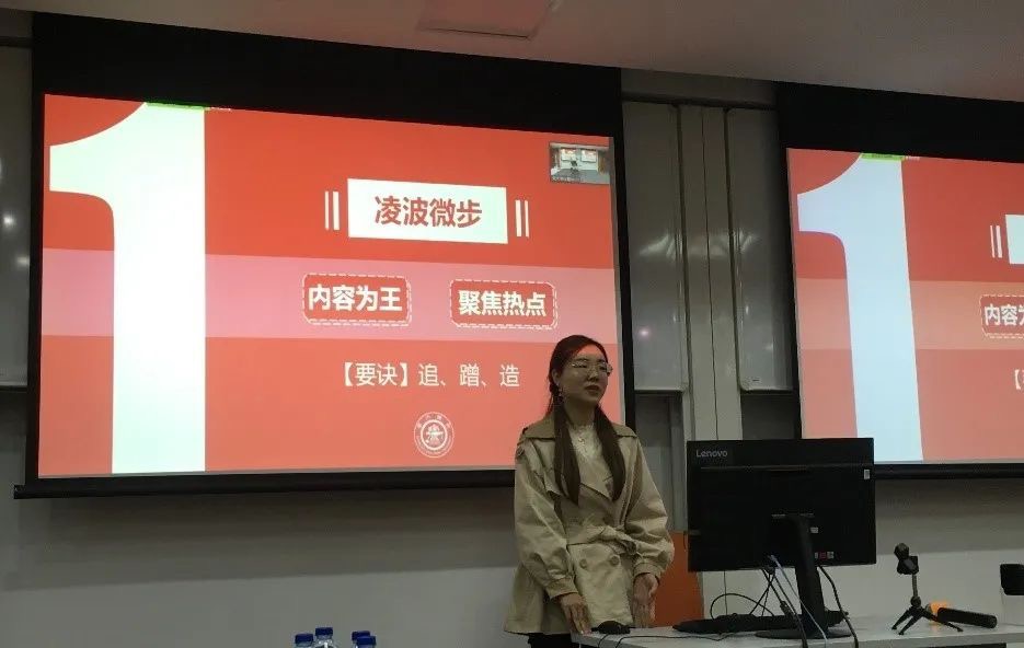 在培训会上,金雪结合自己平日运营学校官方微信、抖音、今日头条、b站等平台的经验,把新媒体运营技巧概括为“融合六式”——凌波微步、九阳神功、太极功、左右互搏术、降龙十八掌和天罡北斗阵,培训内容涉及选题策划、文字撰稿、图片处理、校审及编辑发布等。金雪表示,要做好新媒体,第一要学会抓住重要时间节点,基于重要时间点,推出海量优秀原创作品;第二要学会蹭热点,要抓住网络热点、社会热点,以此表达自己的观点;第三还要学会造热点,金雪老师以她自己在校庆、招生季、军训季、毕业季等各重要时间节点的运营案例,现身说法强调了预热造势的重要性。要创作出精彩优质的内容,凭个人的力量往往是很难做好的,金雪还介绍了学校从“新媒体”到“融媒体”运营背后的教师团队、师生选题团队和学生团队。活动最后,金雪向同学们分享了常用编辑器网站和制作微信推送的实操小技巧,她建议制作推送要注意整体布局、板块间清晰且风格统一,也为同学们提供关于文字排版、色彩参数和图片参数等内容格式方面的建议,强调了推送发布前在手机端上预览检查的重要性。金雪鼓励同学们多利用新技术,尝试卡点、延时、转场和其他创新方法,破解同质化瓶颈,制作出新内容。