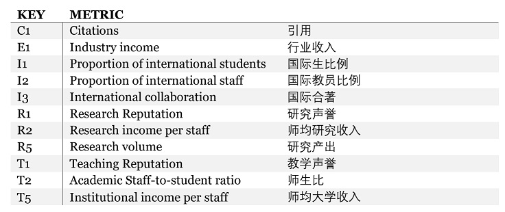 2022年泰晤士高等教育中国学科评级的指标体系主要分为5个方面内容:教学(学习环境)、研究(发表量、收入和声誉)、引用(研究影响力)、国际视野(国际教师、学生和国际合著)、行业收入(知识转移)。