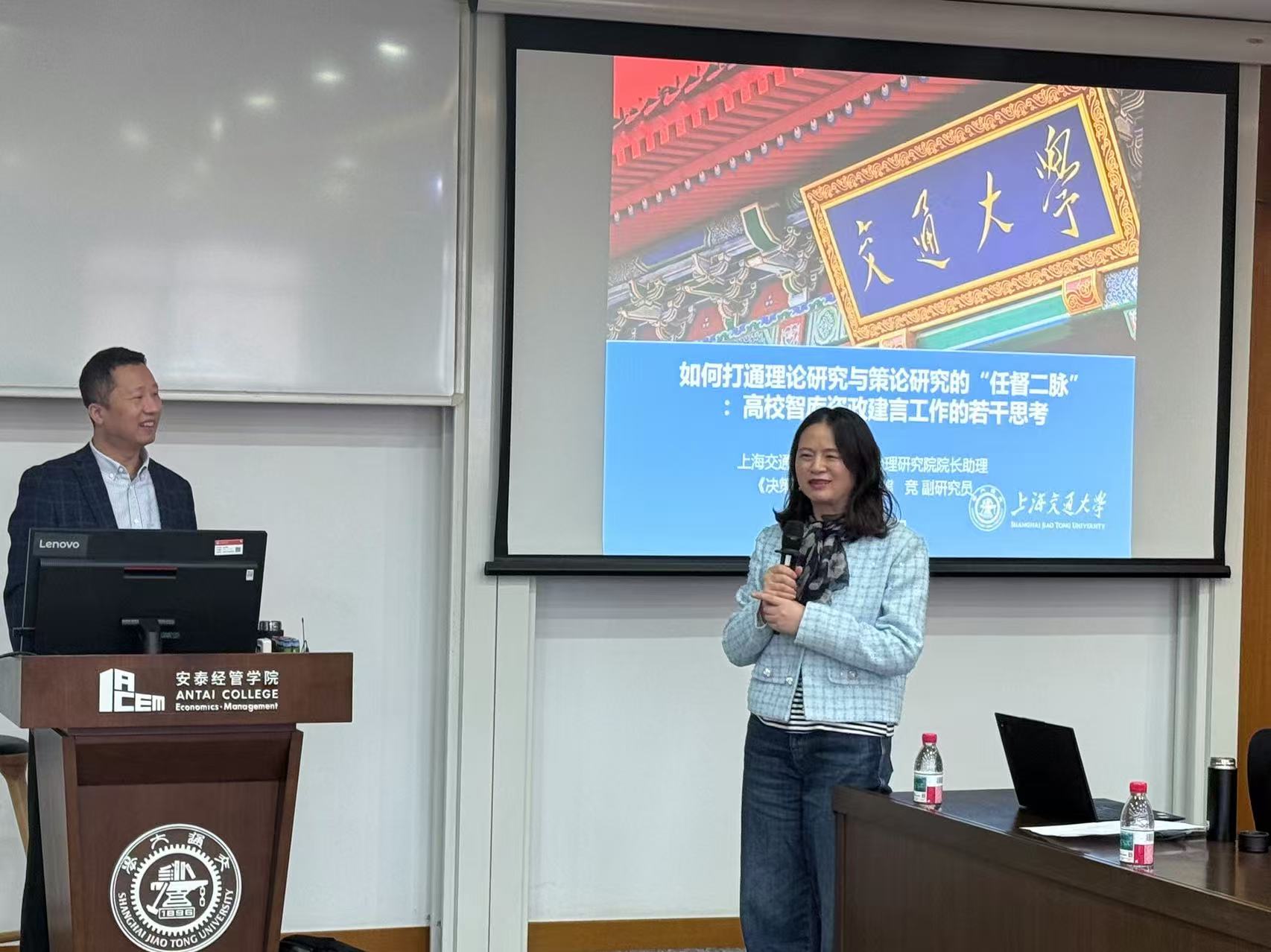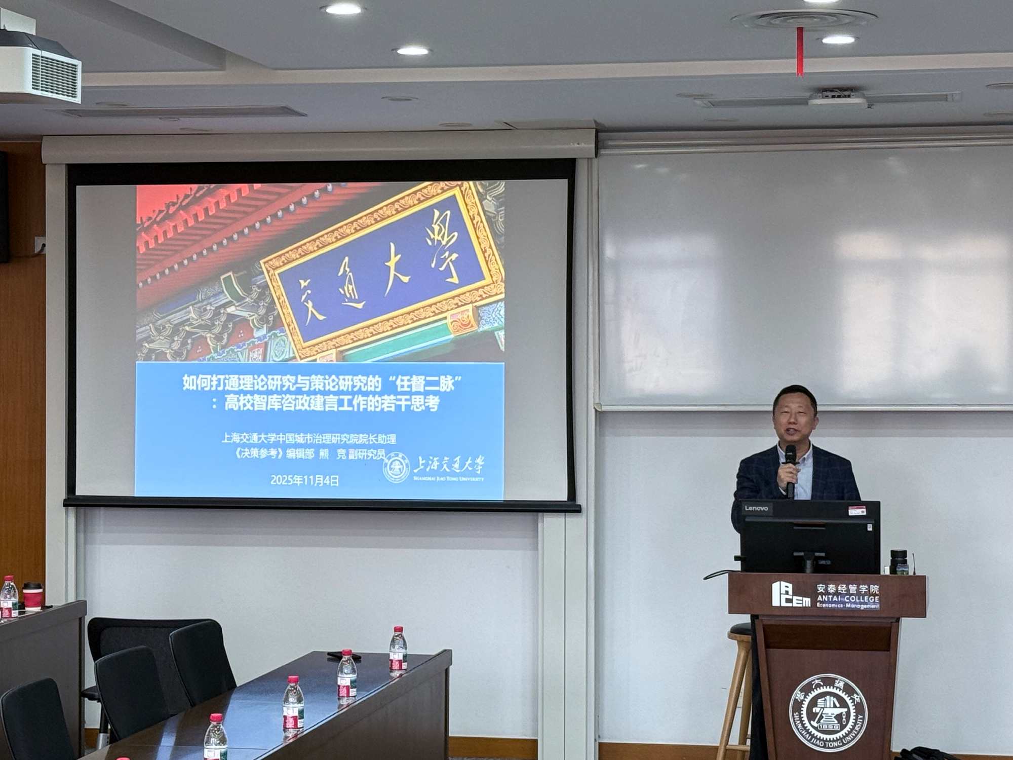 2025年11月4日,上海交通大学数字化管理决策实验室举办“如何打通理论研究与策论研究的‘任督二脉’——高校智库咨政建言工作的若干思考”专题讲座。本次讲座特邀上海交通大学国际与公共事务学院、中国城市治理研究院副研究员熊竞主讲,由安泰经济与管理学院副院长朱庆华教授主持。