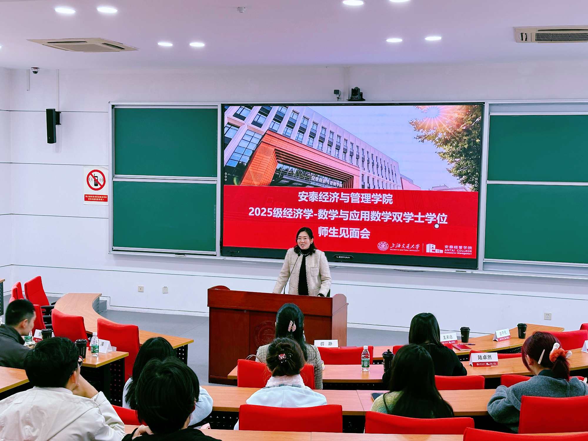 12月1日上午,安泰经济与管理学院2025级经济学-数学与应用数学双学士学位项目师生见面会在闵行校区陈瑞球楼114召开。安泰经管学院副院长瞿茜、经济系系主任喻洋、数学科学学院教师代表、安泰经管学院经济系专业教师代表、教务办公室本科教务老师、经济学-数学与应用数学双学位学生代表及2025级经济学-数学与应用数学双学位全体同学参加本次活动,会议由教务办公室主任薛静主持。